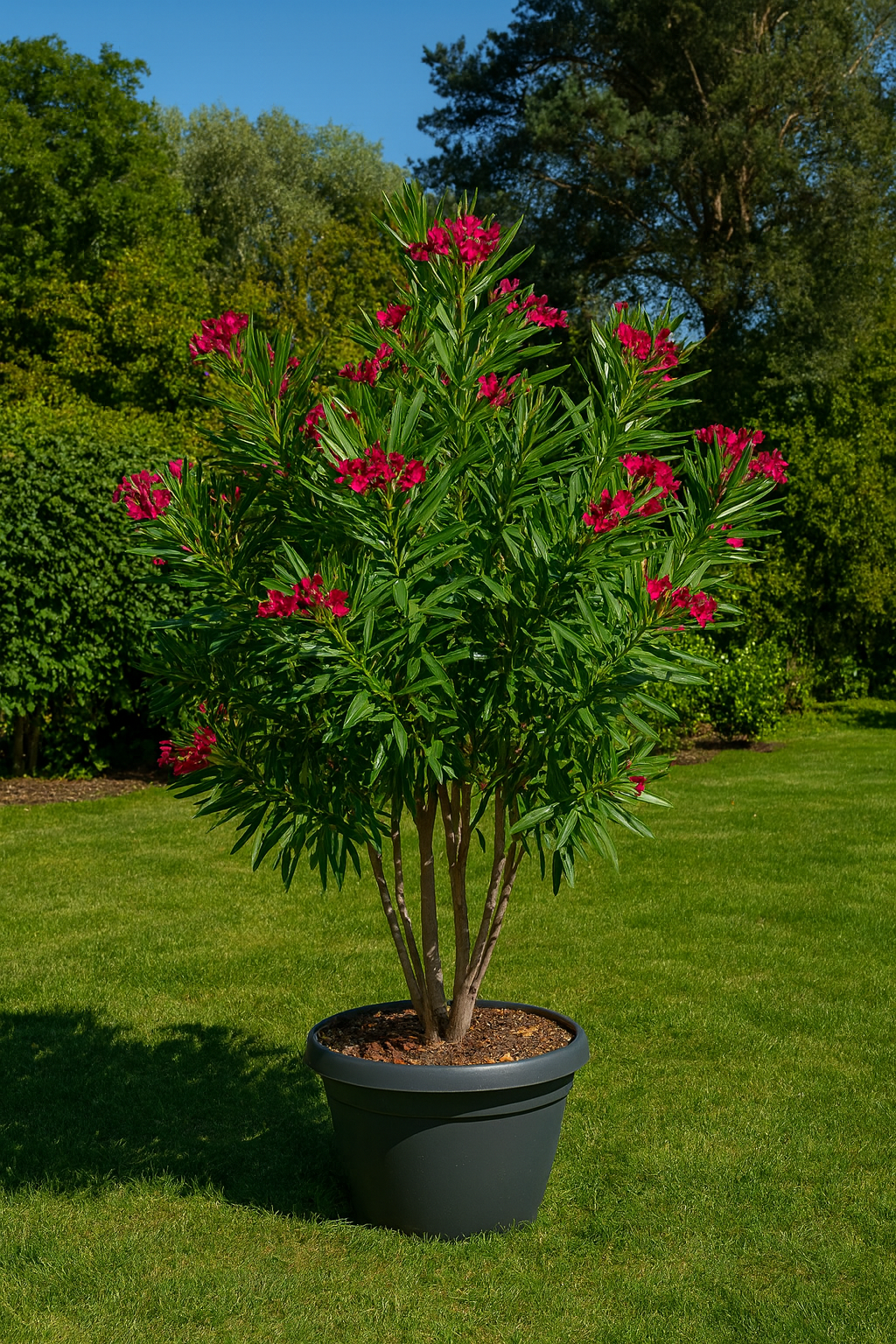 Le Laurier rose cépée remontée, appartenant au genre Nerium de la famille des Apocynaceae, est apprécié pour sa floraison abondante, son port buissonnant élégant et sa grande résistance à la chaleur. Ses fleurs lumineuses, simples ou doubles selon les variétés, s’épanouissent durant tout l’été et parfois jusqu’à l’automne. Son feuillage persistant, vert foncé forme une belle structure graphique, idéale pour structurer les jardins méditerranéens ou les terrasses ensoleillées.