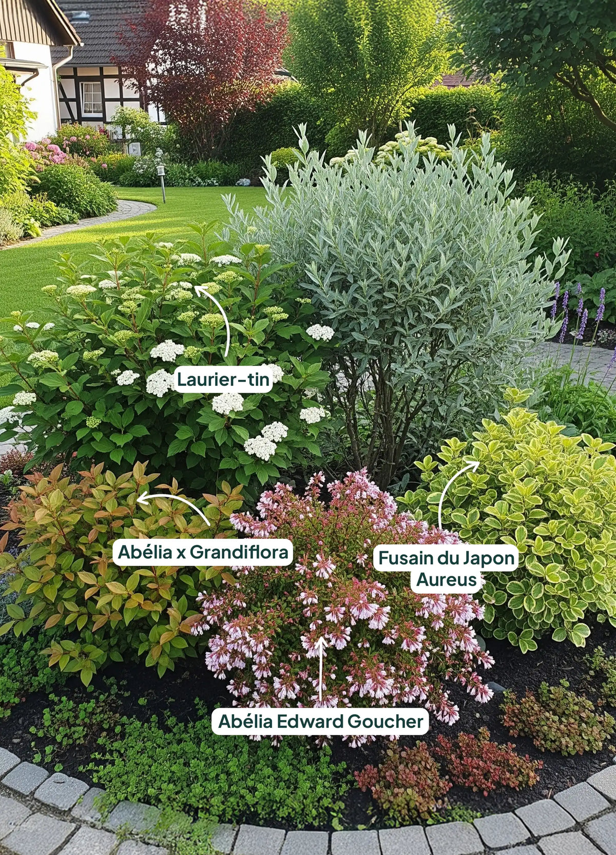 • L’Abélia à grandes fleurs (Abelia x grandiflora) : Ajoute des grappes de fleurs parfumées prolongées par des calices roses persistants.