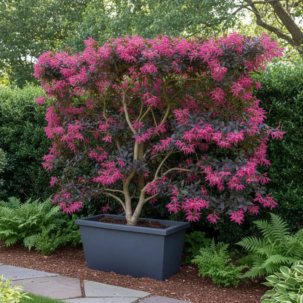 Associez-le avec des arbustes pour un jardin coloré :Le Loropétale de Chine, reconnu pour son feuillage pourpre et ses fleurs éclatantes, s'intègre parfaitement dans les jardins modernes. Associez-le à des arbustes complémentaires pour un contraste saisissant :