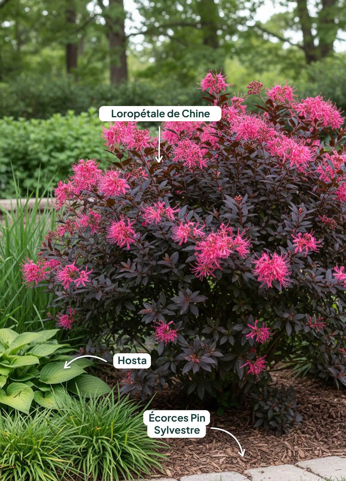 Associez-le avec des arbustes pour une structure variée :Le Loropétale de Chine (Loropetalum chinense) offre une floraison vibrante et un feuillage persistant idéal pour des haies ou des massifs. Enrichissez votre jardin en l'associant à des arbustes variés qui apportent contraste et structure :