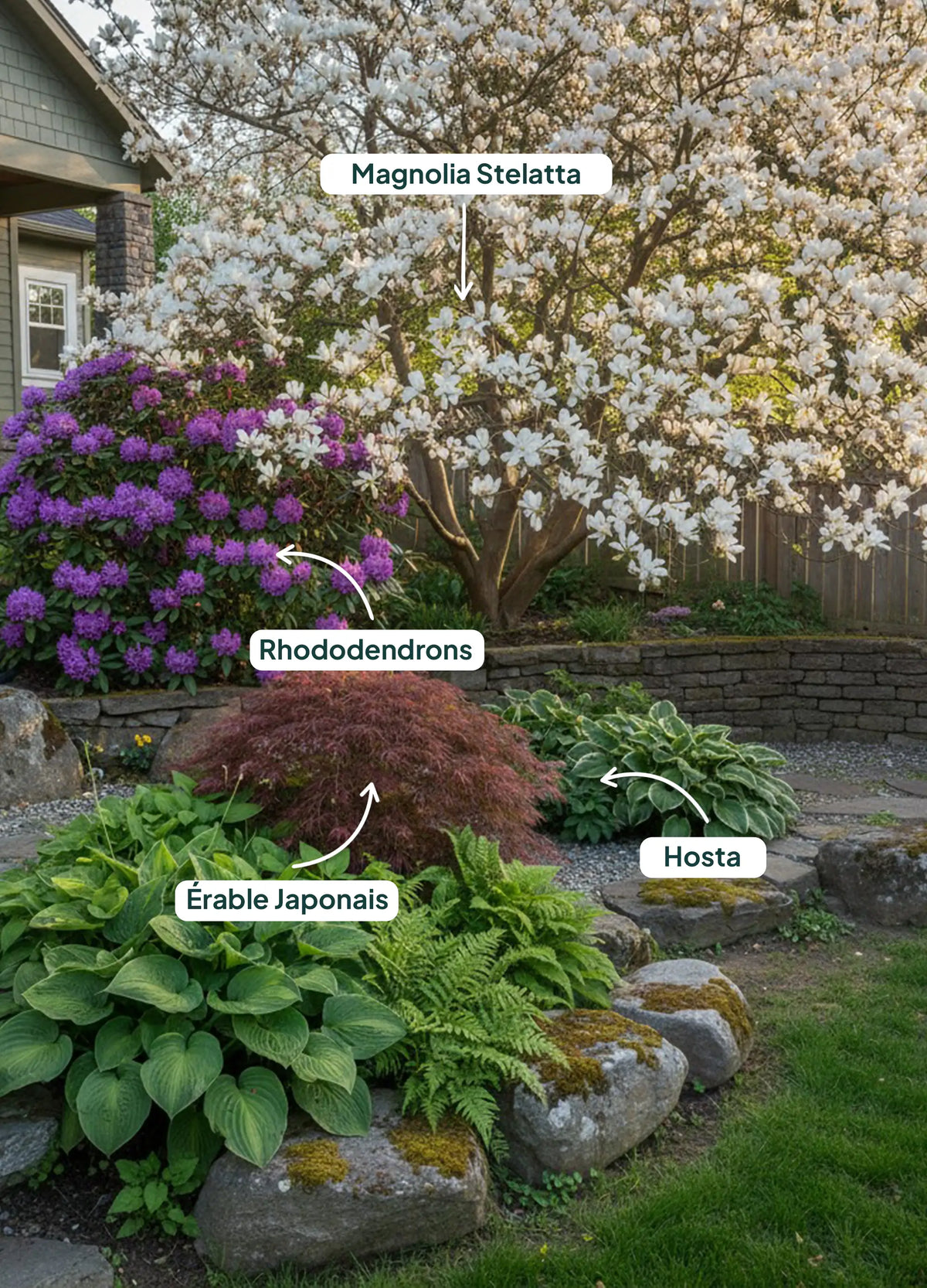 - Le Rhododendron (Rhododendron spp.) : Offre un feuillage persistant et des fleurs colorées qui suivent la floraison du Magnolia.