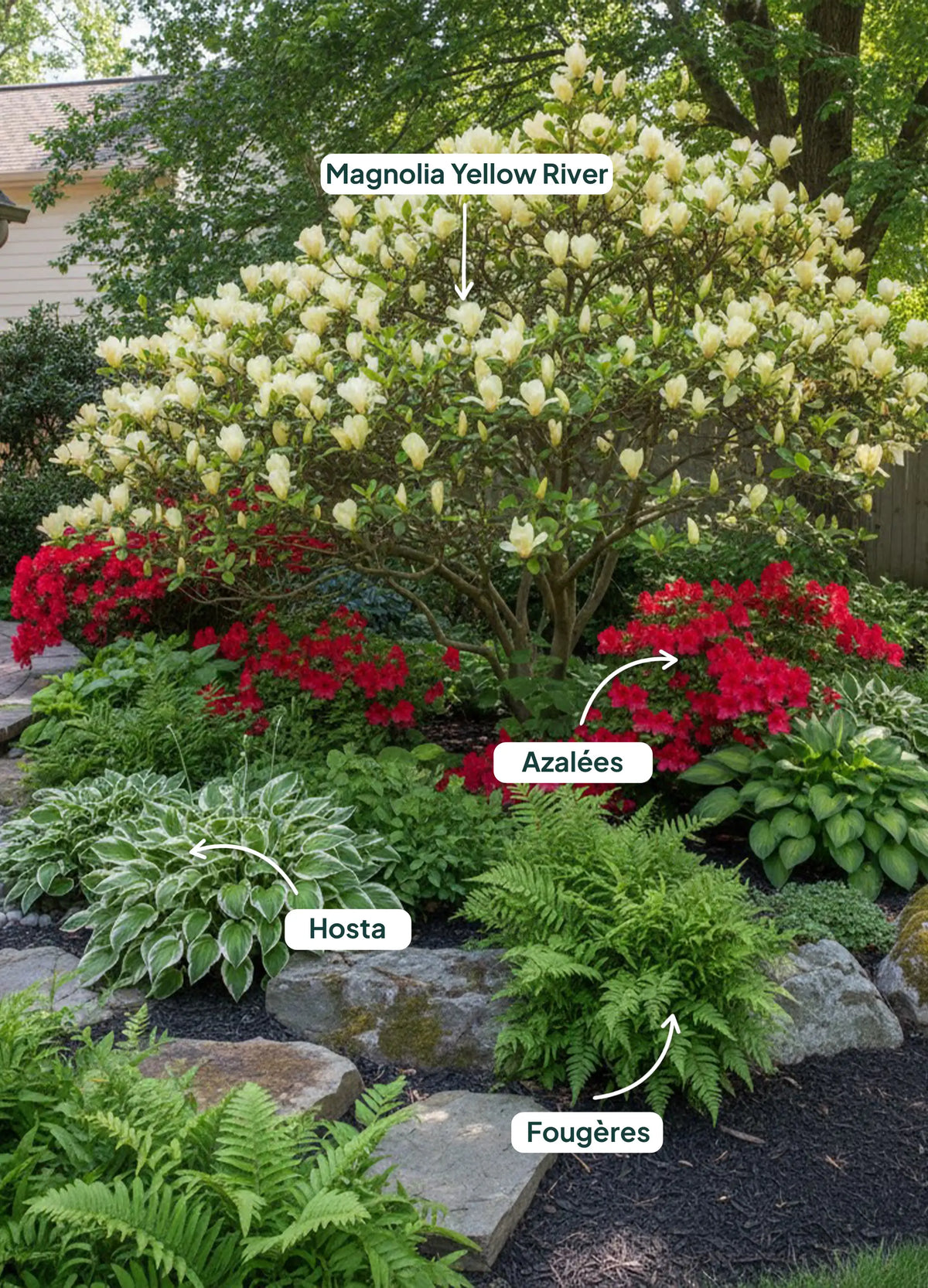 - Le Rhododendron (Rhododendron spp.) : Disponible en de nombreuses couleurs, il crée un contraste luxuriant sous le Magnolia.