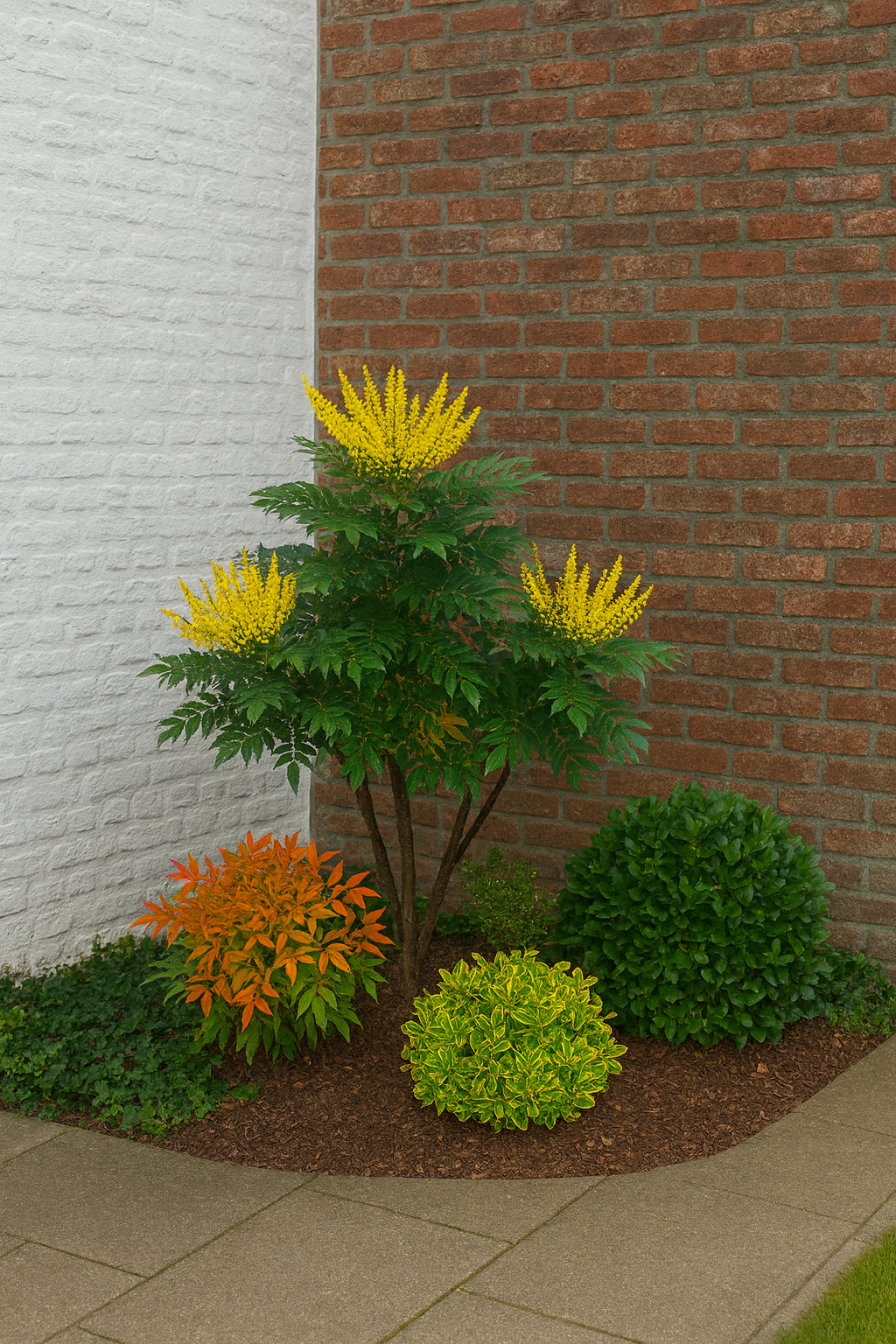 Le mahonia préfère une situation abritée et partiellement ensoleillée. Il se plaît dans un sol meuble et humifère, bien drainé. Évitez les expositions brûlantes et les courants d’air. Laissez environ 60 cm à 1 mètre entre chaque sujet pour une bonne circulation de l’air et un développement harmonieux.