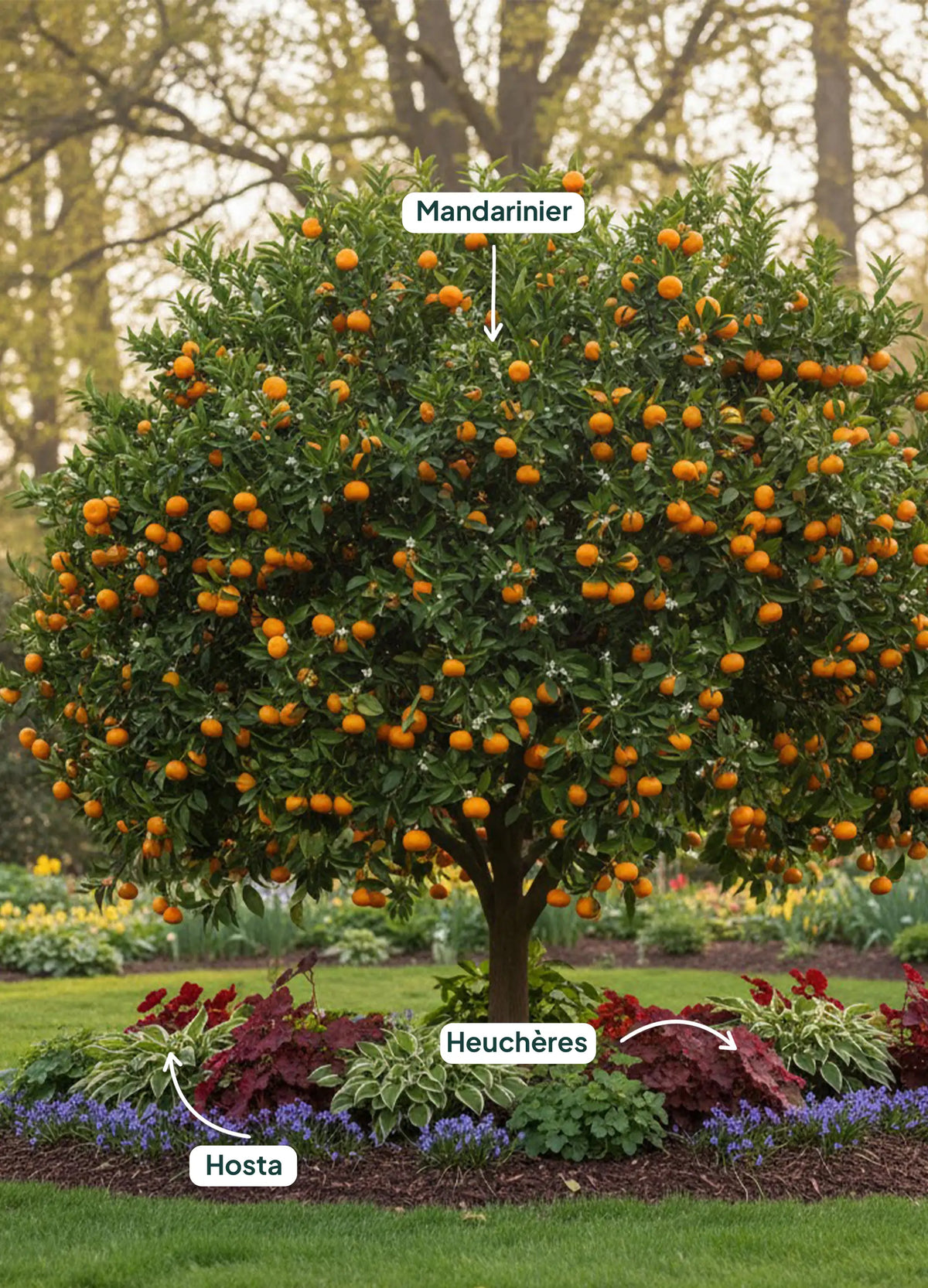 - Le Citronnier (Citrus limon) : Complémente le mandarinier en apportant des notes acides et parfumées.