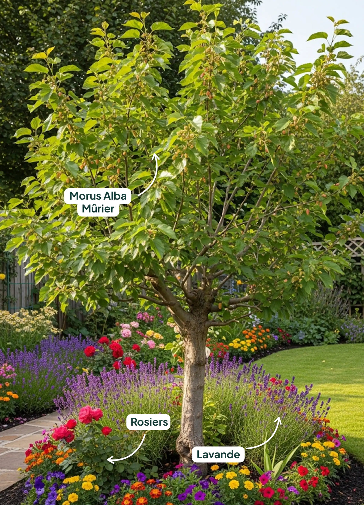 Arbre fruitier robuste, le Mûrier blanc offre un ombrage naturel généreux, une grande longévité et des fruits sucrés appelés mûres blanches. Très tolérant à la chaleur, il s’adapte aux sols drainés et aux climats tempérés chauds.