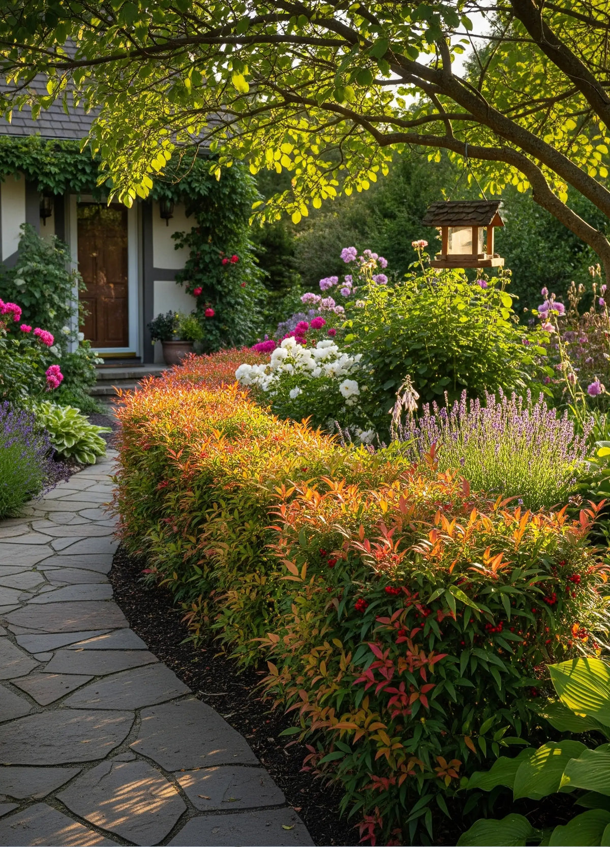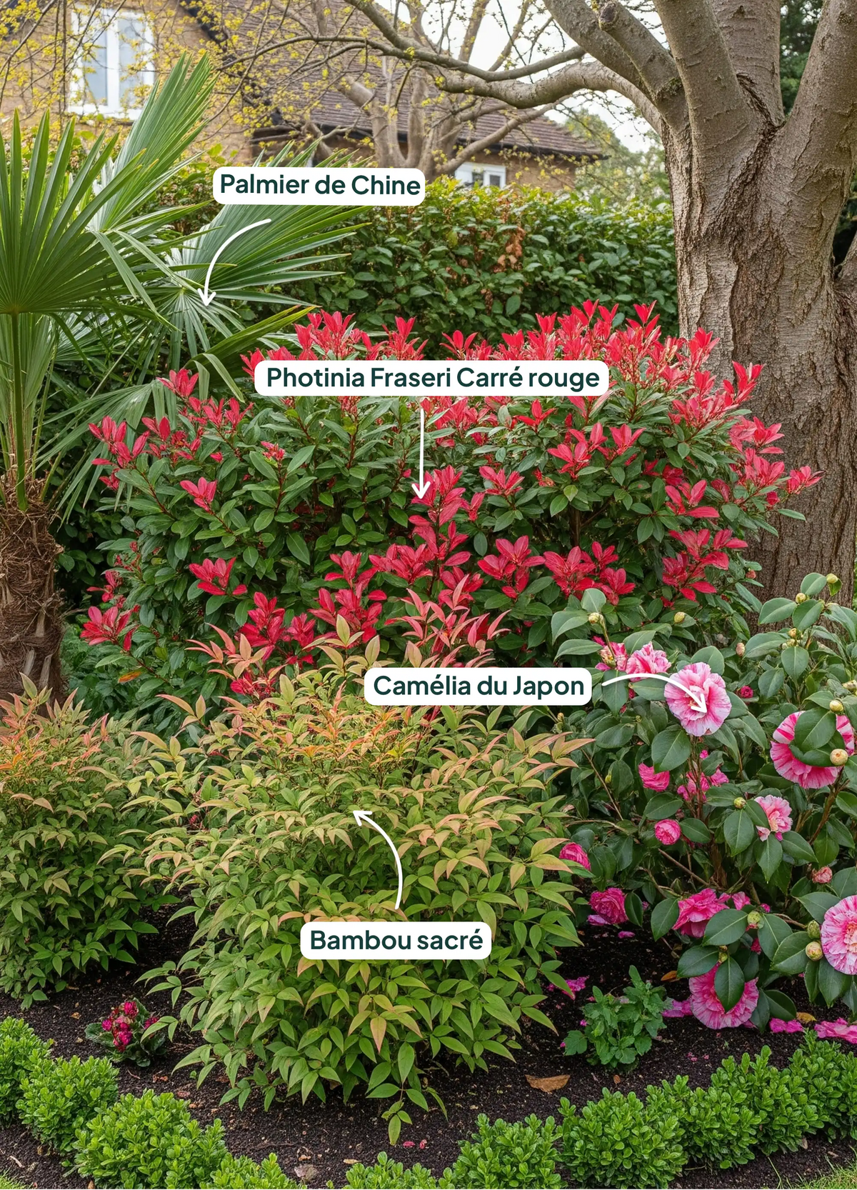 Associez-le avec des arbustes pour une haie variée et colorée :Le Bambou Sacré est apprécié pour son feuillage changeant, passant du vert au rouge éclatant en automne. Il se marie bien avec des arbustes pour former des haies à multiples couleurs et textures :