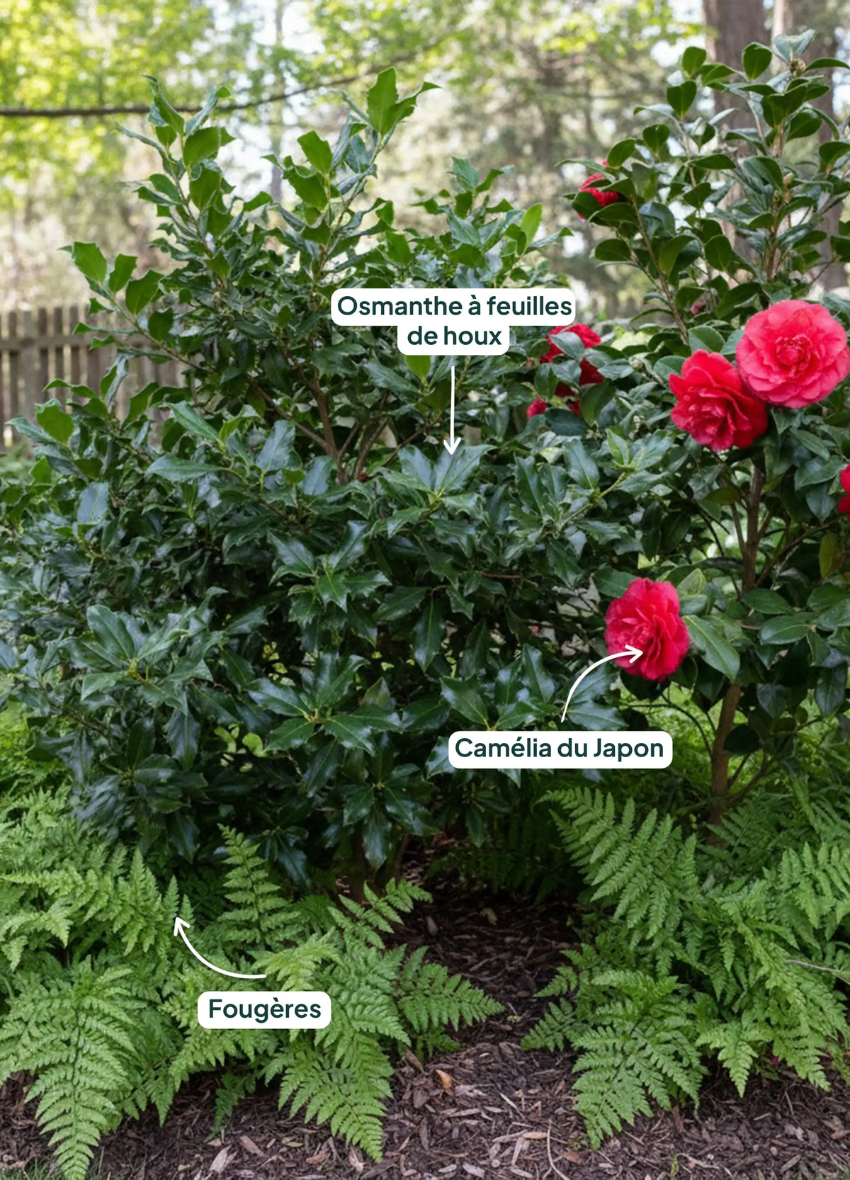 - L’Astilbe (Astilbe spp.) : Offre une floraison légère et gracieuse qui complète l'arrière-plan de l'Osmanthe.