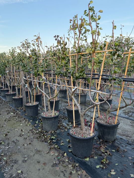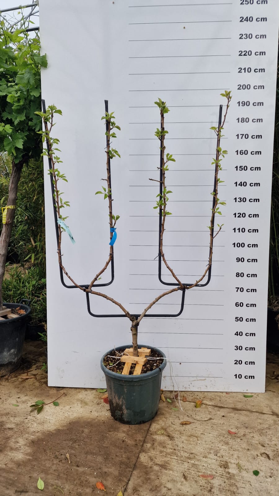 Le Poirier palissé ‘Doyenné du Comice’ est une variété ancienne réputée pour ses fruits fondants, sa culture maîtrisée en palmette et sa production régulière. Grâce au palissage, il s’intègre parfaitement contre un mur ensoleillé, alliant esthétique et rendement élevé dans les jardins structurés.