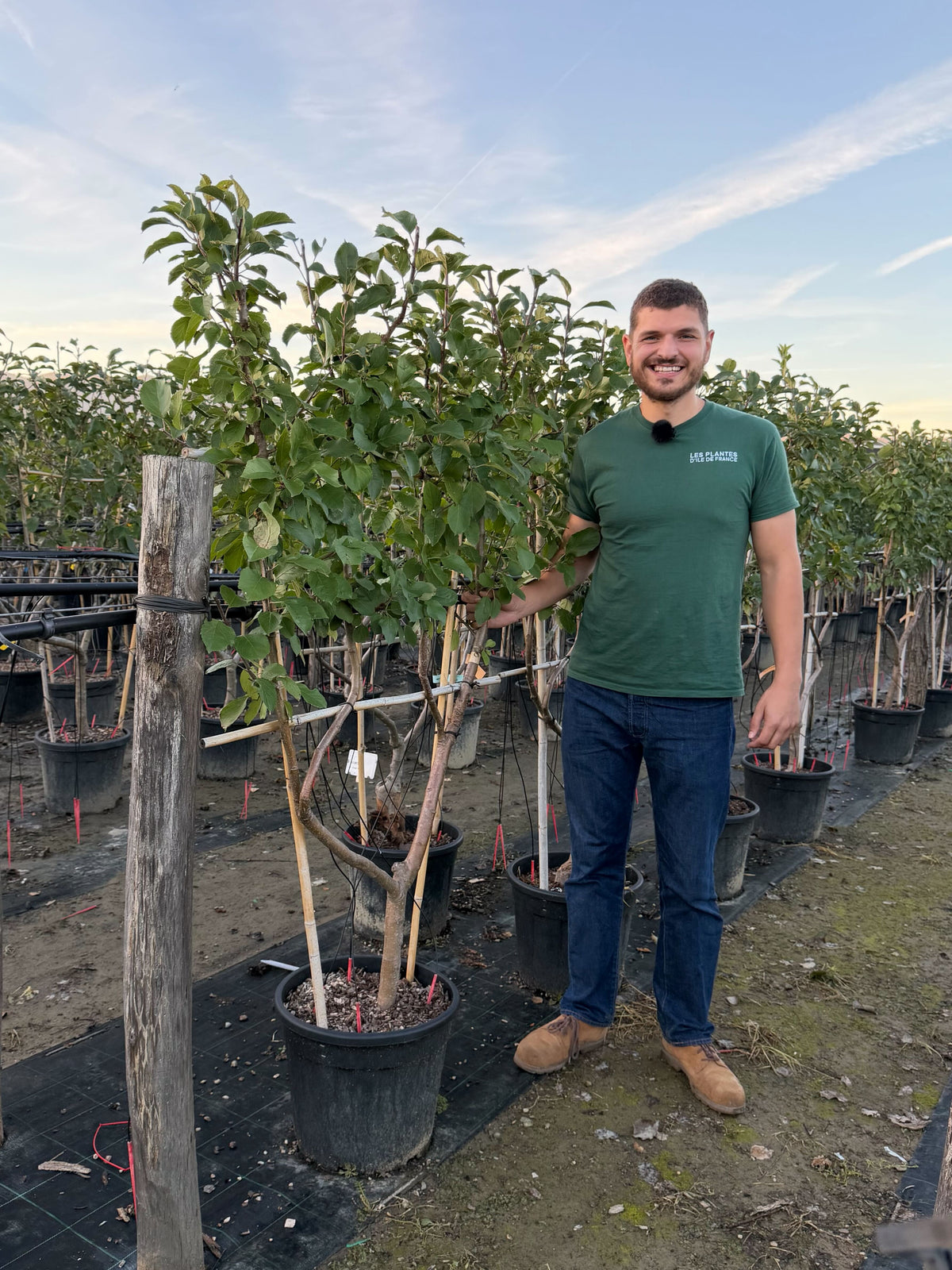 Feuillage caduc vert brillant, feuilles ovales dentées, disposition régulière sur les charpentières, aération améliorée et exposition homogène des fruits. Le palissage favorise une photosynthèse efficace, limite les maladies foliaires et maintient une silhouette plate élégante.