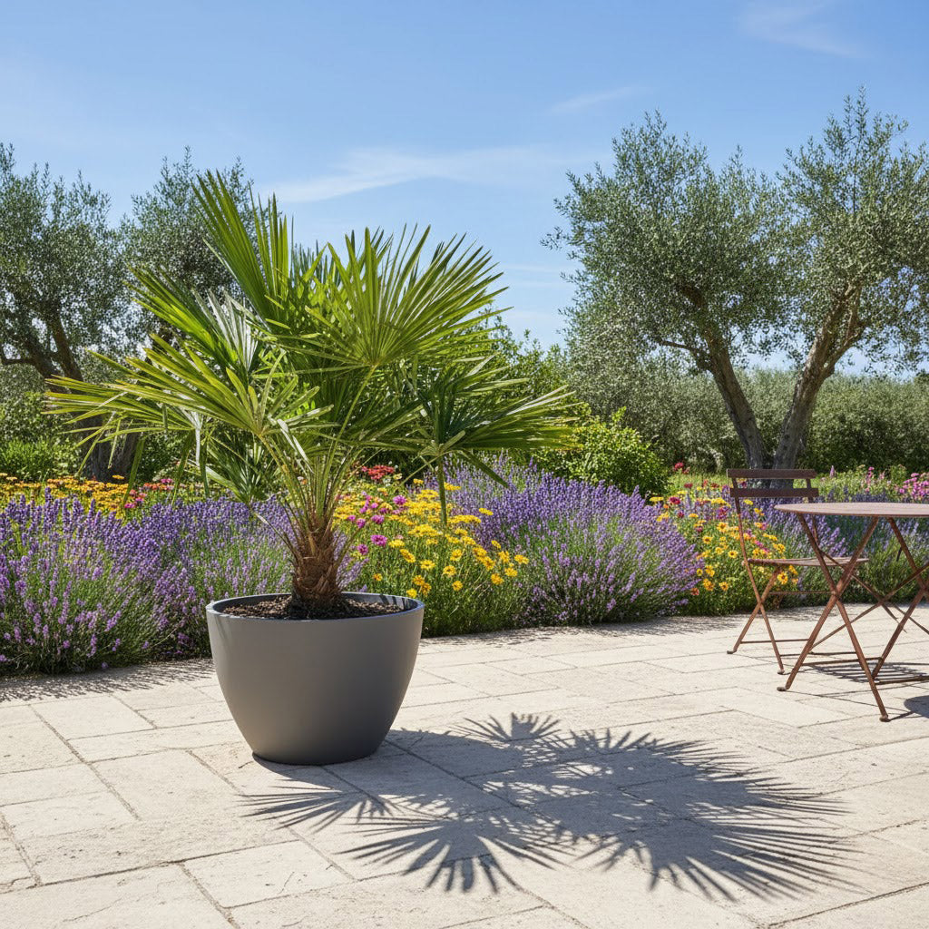 Associez-le avec des arbustes méditerranéens pour un jardin authentique :Le Palmier de Méditerranée est parfait pour un jardin au style méditerranéen grâce à son feuillage persistant et sa tolérance à la sécheresse. Associez-le à des arbustes adaptés pour créer une atmosphère ensoleillée et exotique :