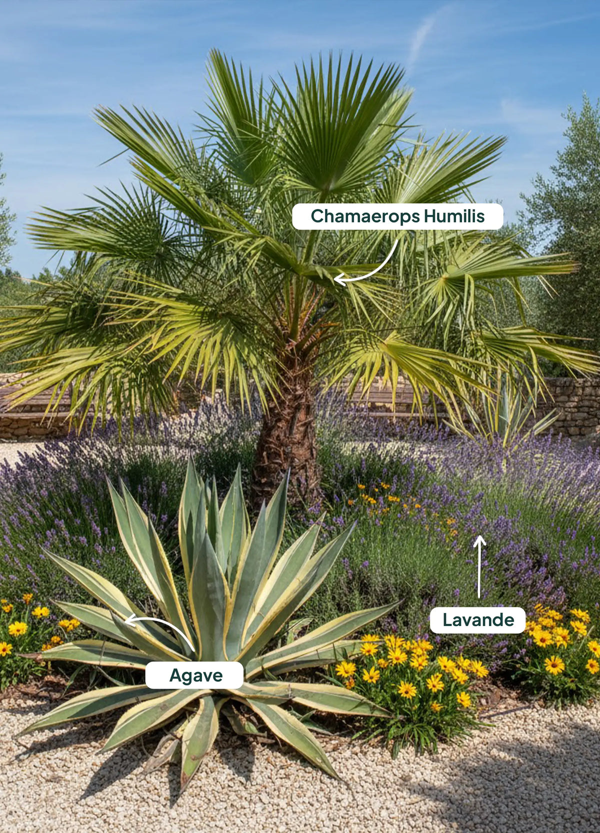 Complétez votre jardin méditerranéen avec des plantes vivaces qui prospèrent en plein soleil et s'intégrent harmonieusement avec le Chamaerops humilis :