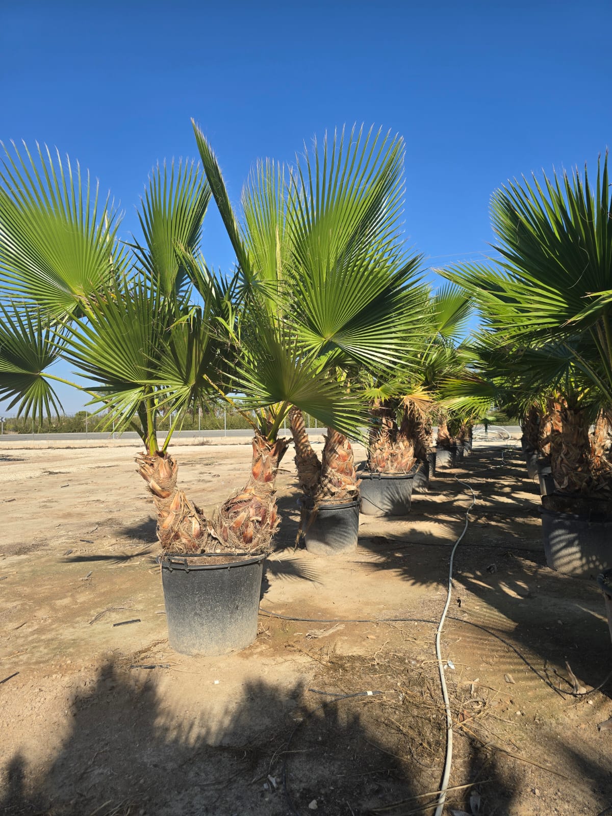 Le Palmier du Mexique en multi-tronc, appartenant à la famille des Arecaceae, est un arbre ornemental très apprécié. Son feuillage persistant et son port élégant lui permettent d'apporter une touche exotique aux jardins et terrasses. Il est reconnaissable à ses stipes multiples, qui offrent une silhouette gracieuse et imposante. Résistant à la chaleur et au vent, il s'adapte à divers climats. Ce palmier est souvent utilisé pour créer de l'ombre, délimiter des espaces ou embellir les aménagements extérieurs. Sa culture n’est pas contraignante, mais il nécessite une exposition ensoleillée, un sol bien drainé et un arrosage modéré.