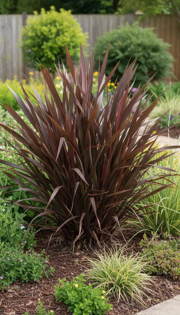 Le Lin de Nouvelle-Zélande peut être accentué par des plantes basses qui créent une bordure inspirante et facile d'entretien :