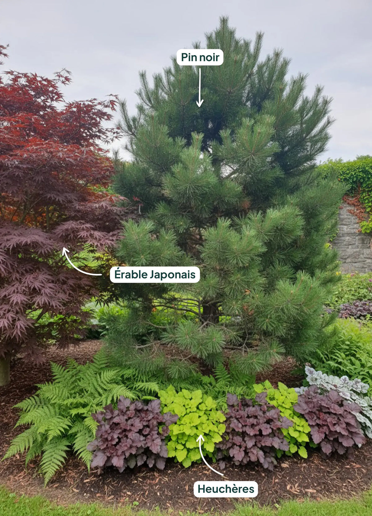 Associez-le avec des arbustes pour créer un contraste saisissant :Le Pin noir, avec son feuillage dense et sa silhouette imposante, se prête parfaitement aux contrastes avec des arbustes colorés ou à feuillage léger. Voici quelques suggestions pour dynamiser votre paysage :