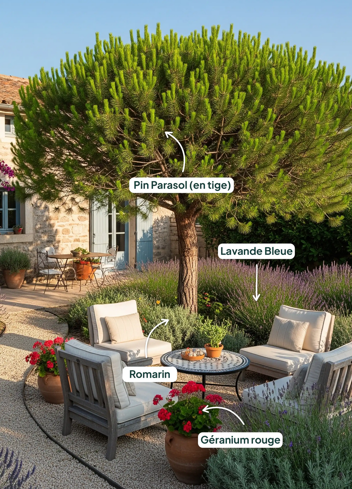 Associez-le avec des arbustes pour un jardin méditerranéen :Le Pin Parasol est un arbre splendide, emblématique des paysages méditerranéens. Associez-le à des arbustes qui partagent ses besoins en soleil et peu d'eau pour renforcer l'effet méditerranéen :