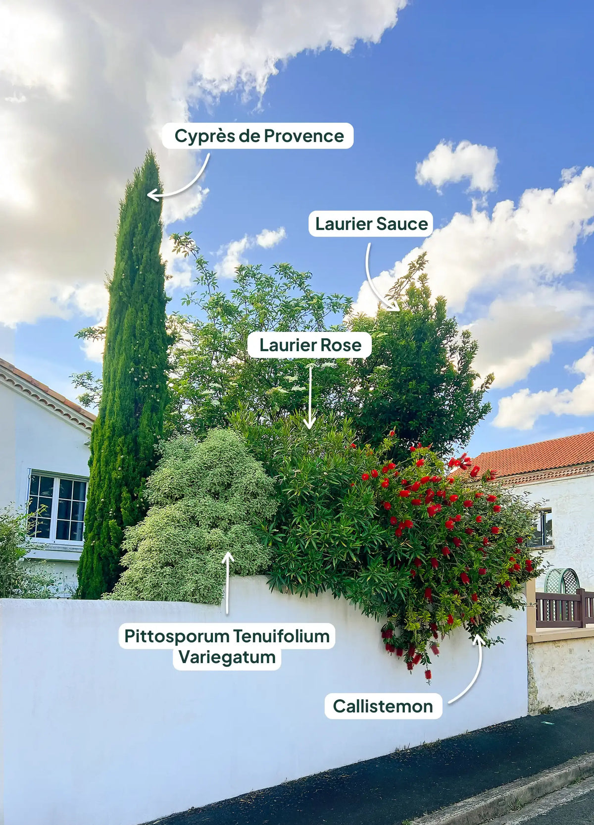 Associez-le avec des arbustes pour haies colorées :Le Rince-bouteille, avec ses fleurs rouges éclatantes, est idéal pour créer une haie vive et attractive. Associez-le à des arbustes complémentaires pour accentuer les couleurs et textures :