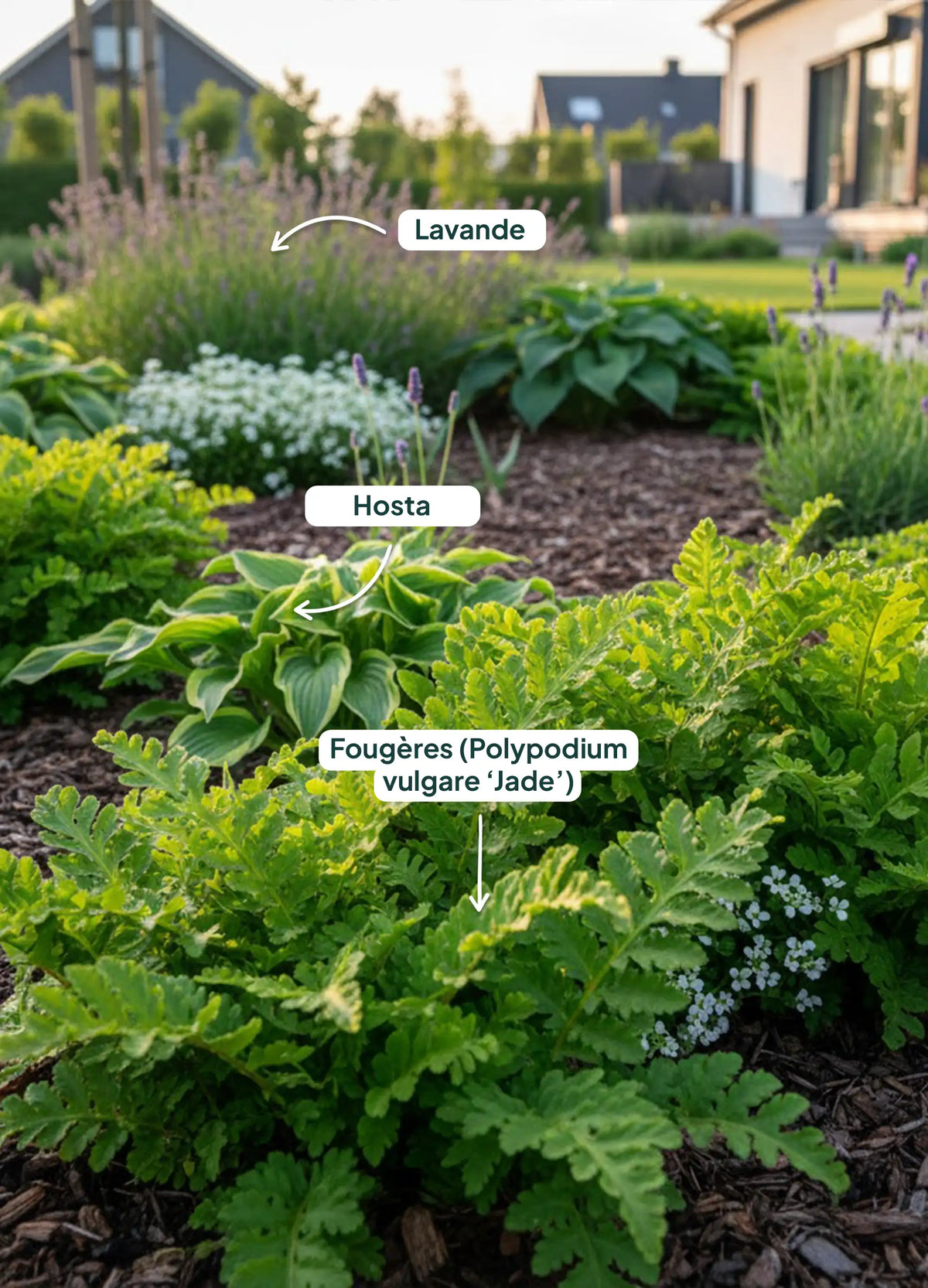 Les couvre-sols peuvent renforcer l'effet naturel de la Fougère Commune et protéger les sols sous des arbres et arbustes.