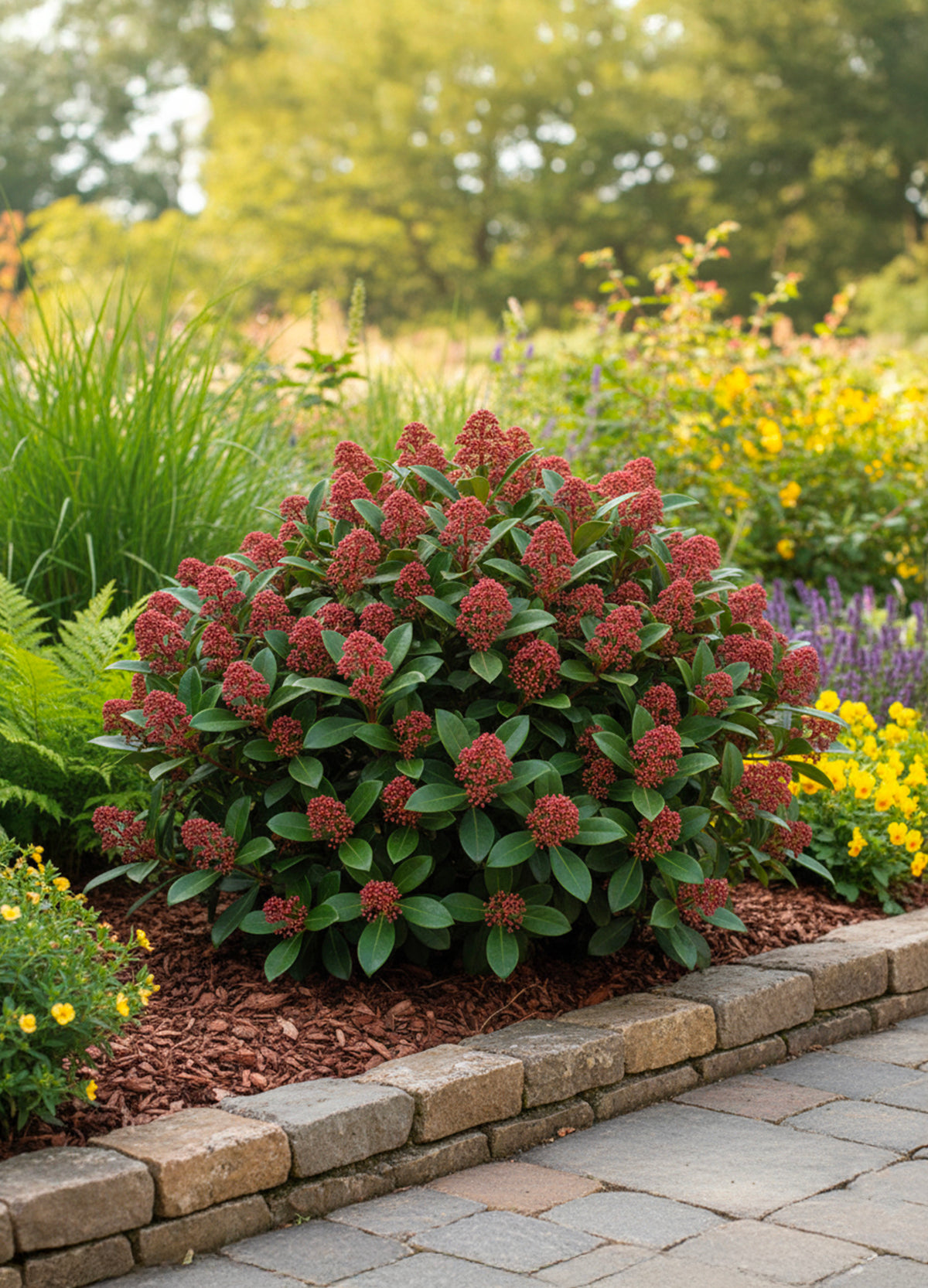 Le Skimmia japonica ‘Rubella’, membre des Rutacées, se distingue par son port compact, ses bourgeons rouges durables et son feuillage persistant. Il s’adapte idéalement aux massifs ombragés, aux terrasses et aux jardins de terre acide, offrant un attrait décoratif toute l’année.