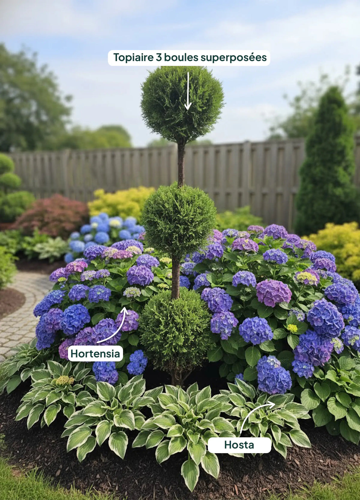 Pour souligner la symétrie des topiaires en boule, choisissez des vivaces qui créent un contraste de formes et de textures :