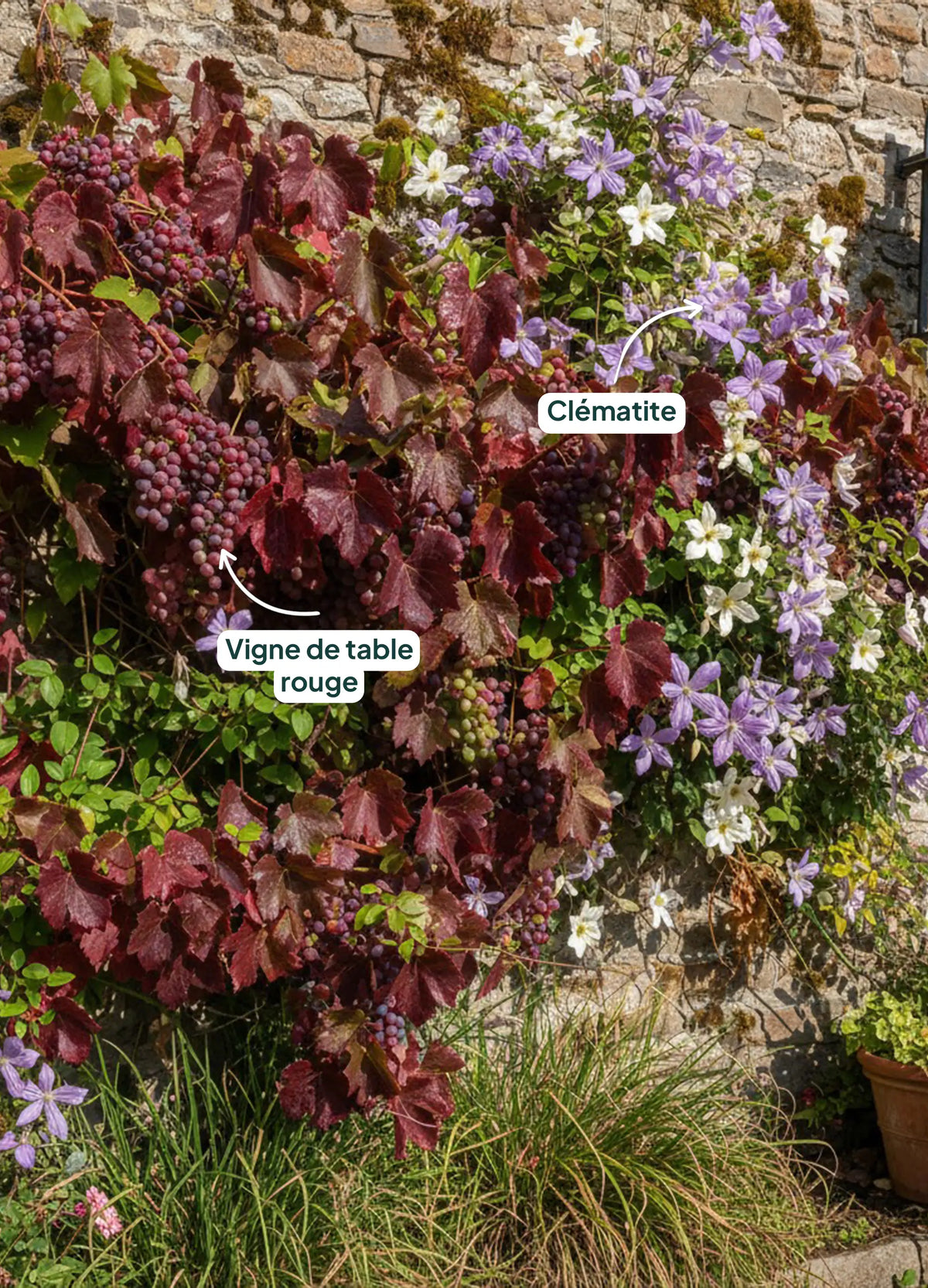 Associez-la avec des arbustes et grimpantes pour un verger harmonieux :La Vigne de table rouge est prisée pour ses grappes colorées. Intégrez-la dans votre verger avec d'autres arbustes et plantes grimpantes qui partagent les mêmes besoins de culture :