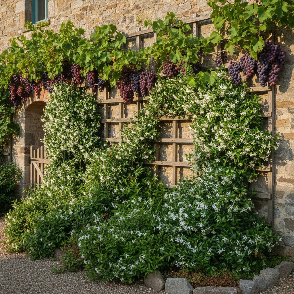 - Le Kiwi (Actinidia deliciosa) : Complète l'espace vertical avec son feuillage luxuriant et ses fruits exotiques.