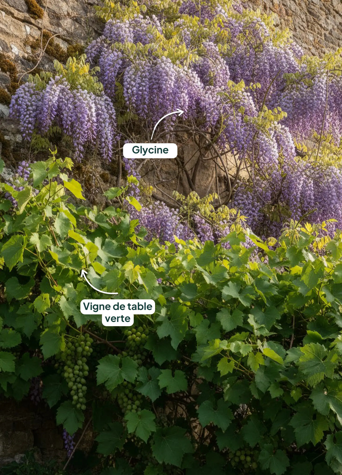 - La Glycine (Wisteria sinensis) : Avec ses grappes fleuries mauves, elle accentue la luxuriance du feuillage de la vigne.